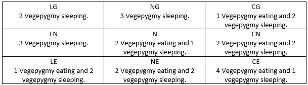 If the PCs approach the vegepygmies peacefully, they will not be attacked on sight and the creatures will attempt to communitcate in their clicking language. If they are give a reasonable offer to leave, the vegepygmies are happy to do so the next night.