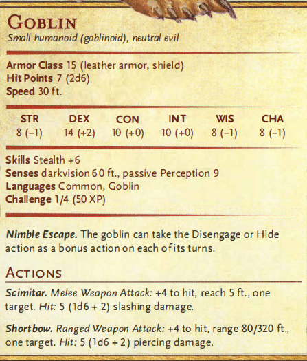 And here’s a fat stat block from Pathfinder 1e. This tells us all the same information as the tall stat, plus specifics on which classes the goblin has, all the numbers a GM might need to derive in any situation, and a complete breakdown of equipment and the organisation of a goblin group.