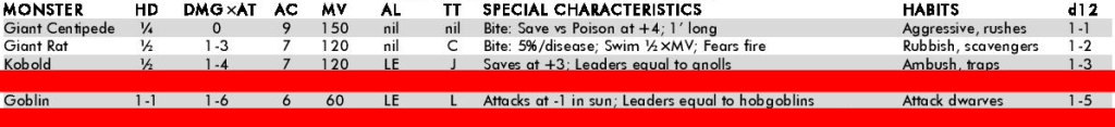 Here’s a short stat block from D&D Basic. As you can see it gives almost no information. How much health they have, how much damage they deal, what their AC is, their movement speed, their alignment, which treasure table you roll on, any special abilities, two word description of how they act, and a random encounter chance. Honestly, this is all the information we need to provide for 90% of GMs.